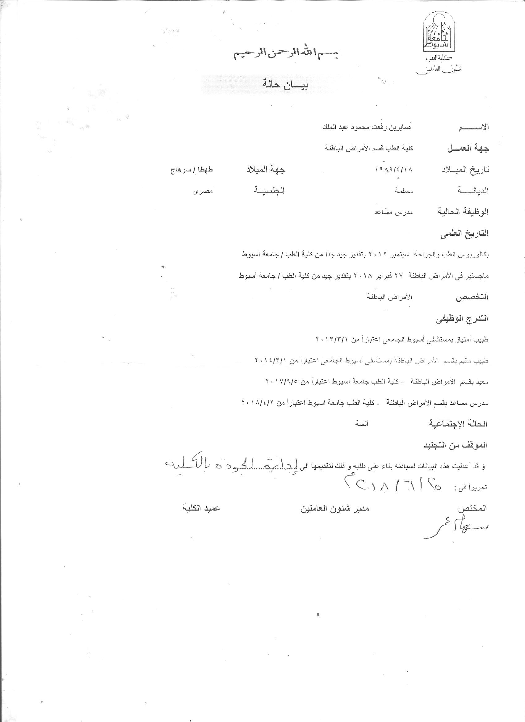 Assistant Lecturer, Faculty of Medicine, Assiut University, 2018