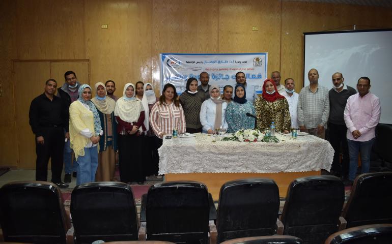 فريق الجودة والتميز وبحضور لفيف من السادة أعضاء هيئة التدريس ومديري الإدارات والعاملين بالكلية تم وبدء اللقاء بتقديم السيد/ سيد حسن محمد عرض توضيحي وشرح الجوائز وآليات التقدم وسبل الدعم الفني ثم قام بالرد على استفسارات السادة أعضاء هيئة التدريس والعاملين بالكلية، وحضر اللقاء فريق الجودة والتميز بالجامعة كلا من