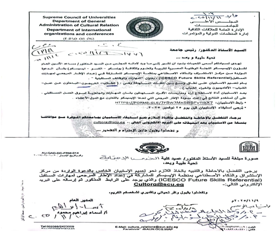 وفي إطار حرص المجلس الأعلى للجامعات على دعم وتنمية قدرات أعضاء هيئة التدريس والكوادر الأكاديمية، بشأن الدعوة الواردة من منظمة العالم الإسلامي للتربية والعلوم والثقافة (الإيسيسكو)، للمشاركة في إعداد الإطار المرجعي لمهارات المستقبل (ICESCO Future Skills Referential).