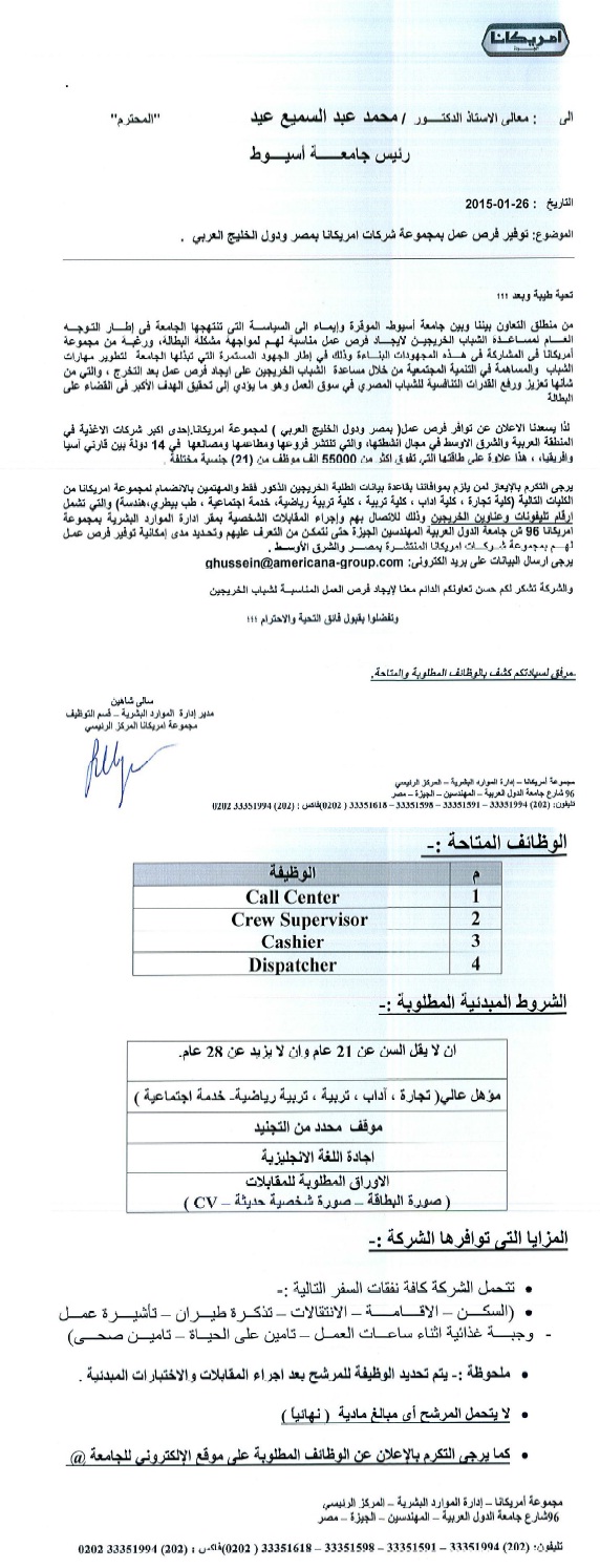 توفير فرص عمل بمجموعة شركات امريكانا بمصر و دول الخليج 16 فبراير 2015 توفير فرص عمل بمجموعة شركات امريكانا بمصر و دول الخليج