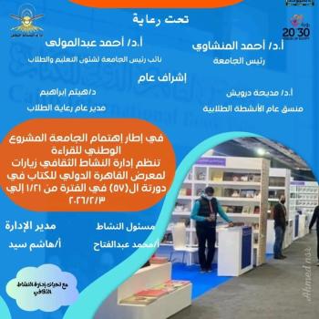إدارة النشاط الثقافى .. في إطار اهتمام الجامعة بالمشروع الوطني للقراءة تعلن الادارة عن تنظيم زيارات لمعرض القاهرة الدولى للكتاب فى دورتة ال ( 57 )