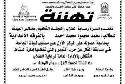 كلية الهندسة-تهنئة الطالب/ محمد محمود بمناسبة حصولة على المركز الأول على مستوى كليات الجامعة فـي مسابقة المقال عن حرب أكتوبر