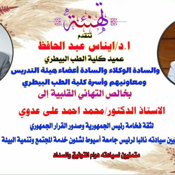 نقلا عن الموقع الرسمي لجامعة اسيوط الدكتور المنشاوي يهنئ الدكتورة إيناس عبدالحافظ بمناسبة صدور القرار الجمهوري بتعيينها عميدةً لكلية الطب البيطري قدّم الدكتور أحمد المنشاوي، رئيس جامعة أسيوط، خالص…