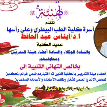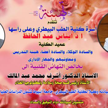 تتقدم الاستاذ الدكتور / مديحة حسنى درويش عميد الكلية الأسبق والمشرف على كلية الطب البيطري - جامعة الازهر  بخالص التهاني القلبية للأستاذ الدكتور /ايناس احمد عبد الحافظ لثقة فخامة رئيس الجمهورية /…