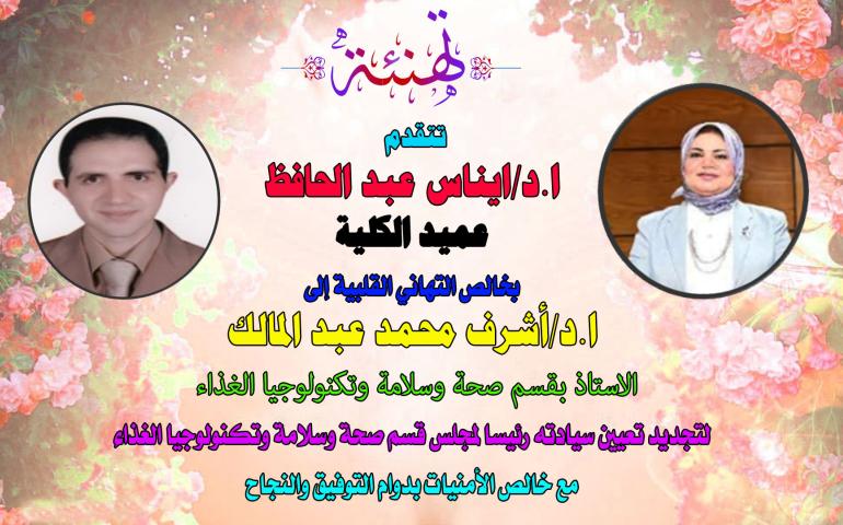 تهنئة : تجديد تعيين ا.د/ اشرف عبد المالك رئيسا لمجلس قسم صحة وسلامة وتكنولوجيا الغذاء